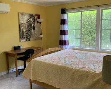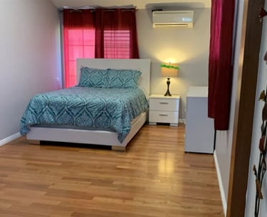 Upstairs Queen Solo Room featuring a comfortable queen bed, self-controlled AC, and a private upstairs space, with access to a shared downstairs bathroom. Ideal for amazing and strong ladies who want a cozy retreat with great value.